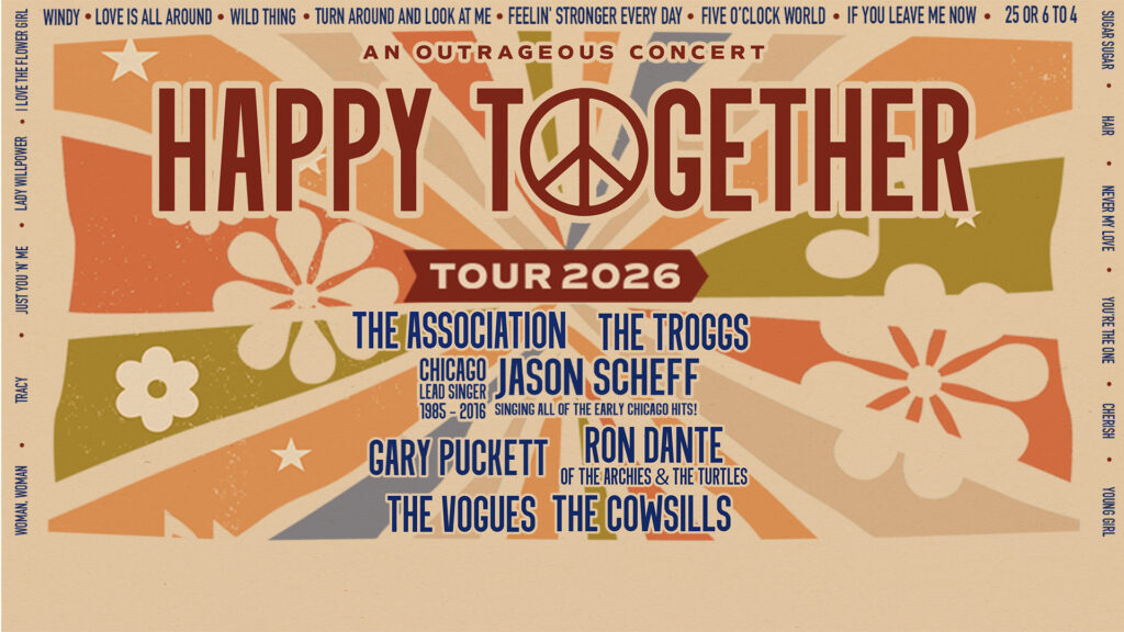 THE LINE-UP FEATURES RETURNING FAVORITES AND NEW ADDITIONS: THE ASSOCIATION, THE TROGGS, CHICAGO lead singer 1985-2016 JASON SCHEFF, GARY PUCKETT, RON DANTE from The Archies and The Turtles, THE VOGUES and THE COWSILLS. 2026 will mark the 17th year of the highly successful, hit-filled summer package, THE “HAPPY TOGETHER” TOUR. The touring sensation that […]